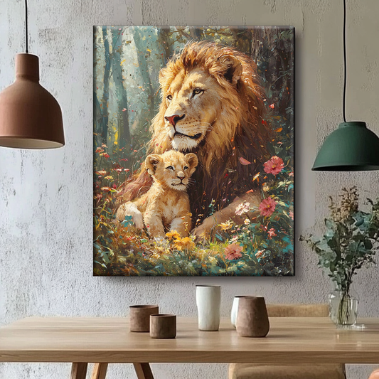 Amour de lion dans la mer de fleurs - peinture par numéros